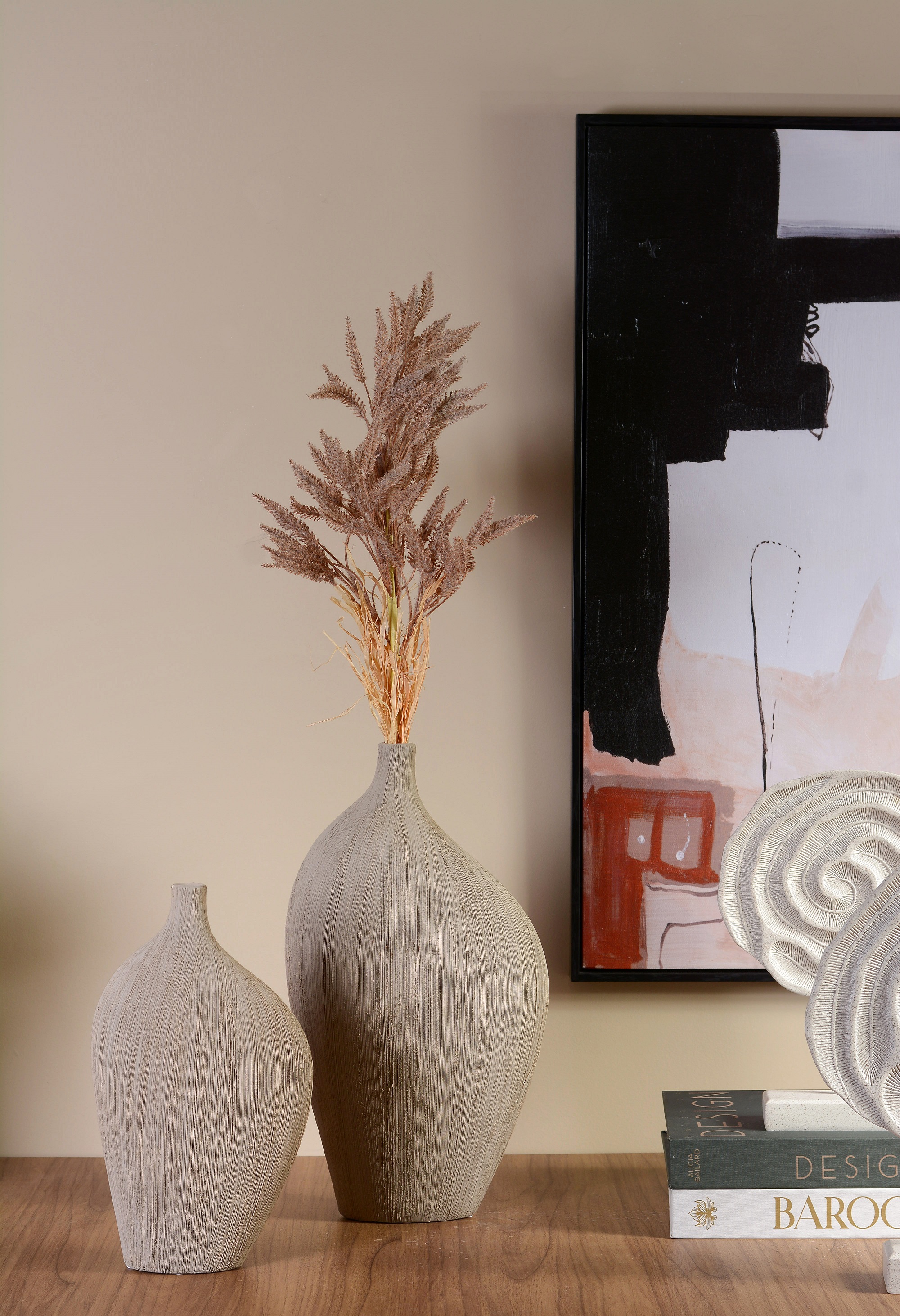 A textura é um dos elementos mais marcantes da Coleção Sintonia. Vasos de cerâmica e porcelana, esculturas de resina com acabamento rústico e abajures de cerâmica são apenas alguns dos itens que trazem um toque artesanal e único para os ambientes.