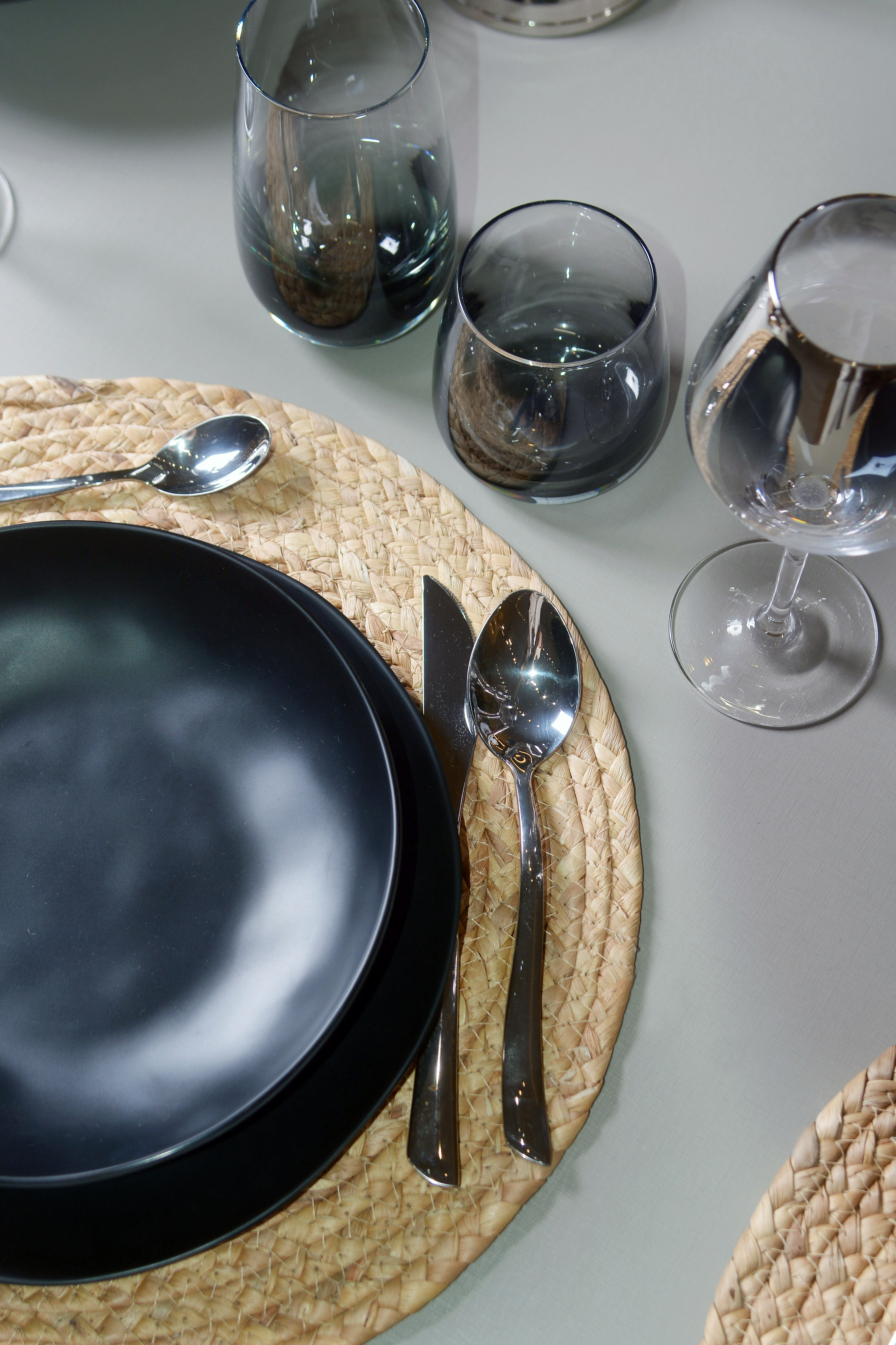 Uma mesa posta com elementos em preto e prata - pratos de porcelana preta, talheres prateados e copos de cristal – faz com que essa composição não só reflita bom gosto, mas também crie uma atmosfera de tranquilidade e luxo discreto. O preto adiciona profundidade e seriedade, enquanto o prata traz um brilho sutil que ilumina o ambiente, criando uma sensação de aconchego e exclusividade.