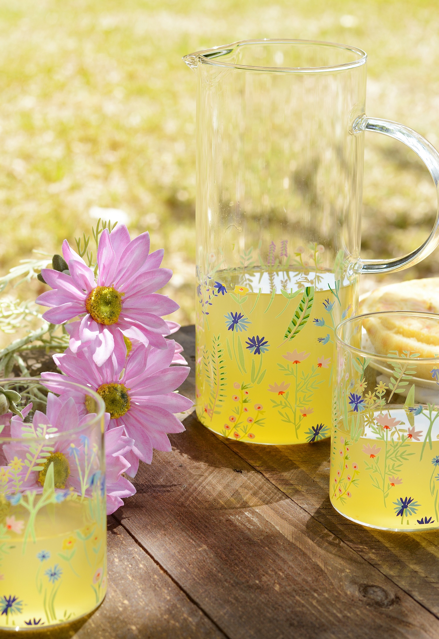 As jarras e copos de vidro com decorações florais completam a mesa, refletindo a essência da primavera e trazendo um toque delicado ao ambiente.